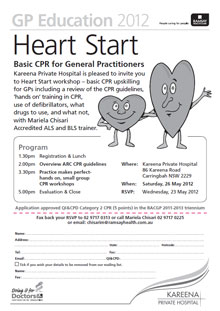 Kareena Private invites all local GP’s to the Heart Start workshop- a basic CPR upskilling for GPs including review of the CPR guidelines, ‘hands on training in CPR, use of defibrillators, what drugs to use, and what not with Mariela Chisari Accredited ALS and BSL trainer.